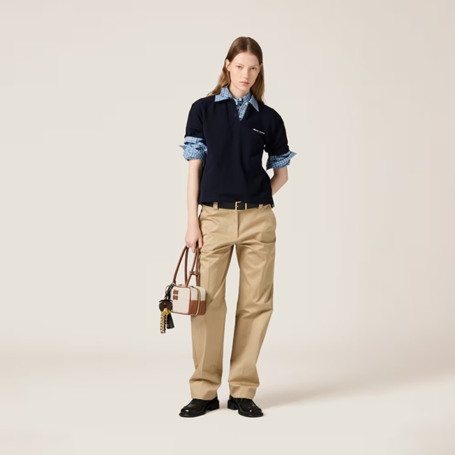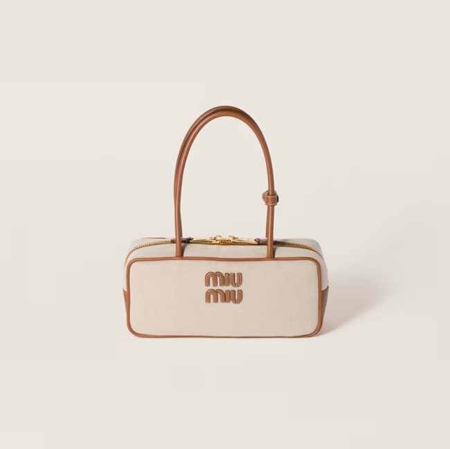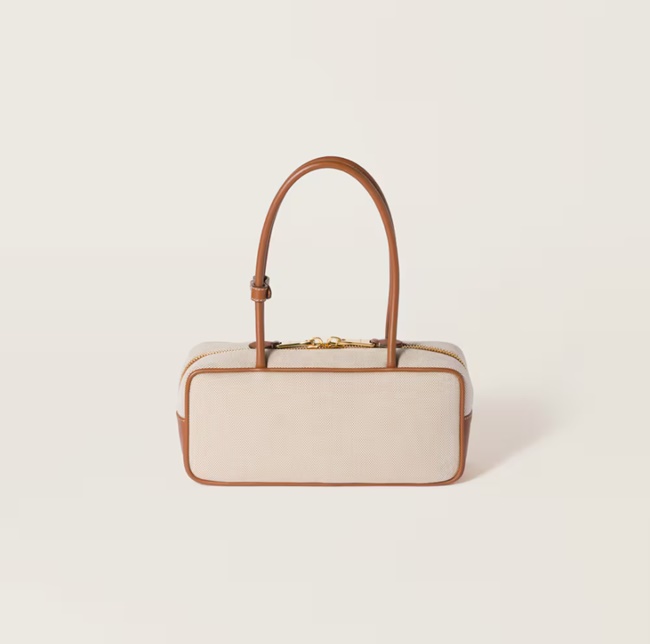 미우 미우 캔버스 레더 탑 핸들백 베이지 브랜디 5BB147