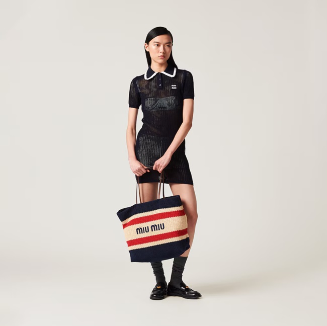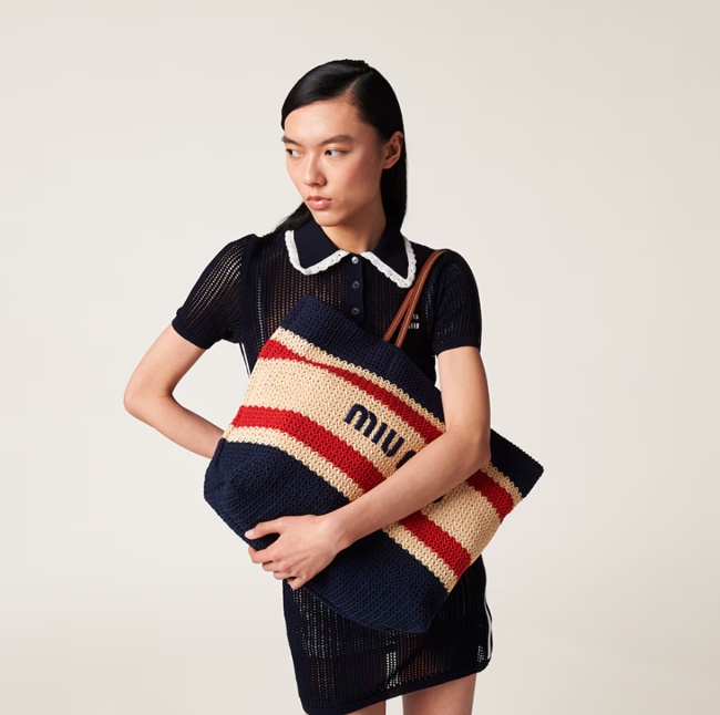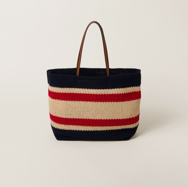 미우 미우 라피아 앤 코튼 토트백 베이지 블루 5BG228