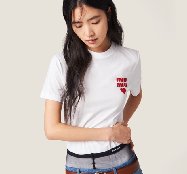 미우 미우 하트 로고 자수 패치 코튼 티셔츠