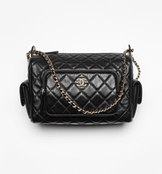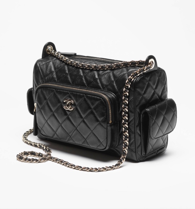 샤넬 카메라 케이스 샤이니 크럼플드 램스킨 & 골드 메탈 블랙 AS5156